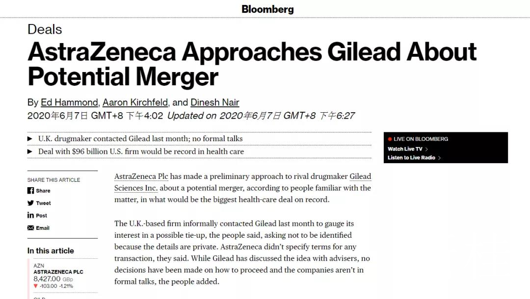 知情人士表示,阿斯利康上個月聯系了吉利德,以尋求可能的合作。知情人士補充說,盡管吉利德公司已經與財務顧問討論了這個想法,但目前還尚未決定,兩家公司也沒有進行正式談判。目前無法聯系到吉利德公司的發言人。阿斯利康的發言人未對“這個消息”發表評論。