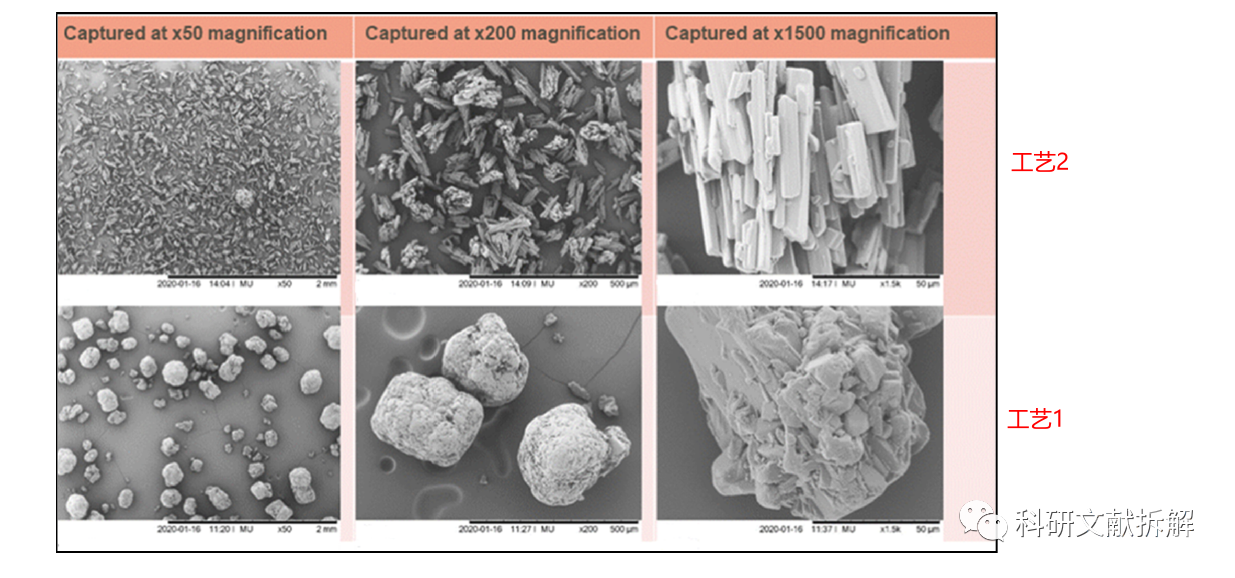 通過XRD檢測兩種工藝的物料晶型一致,但是通過SEM觀察微觀晶體形態發現了差異: