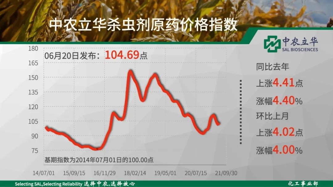2021年06月20日,中農(nóng)立華原藥價格指數(shù)報125.02點,環(huán)比上月上漲6.64%,這主要是草甘膦原藥的持續(xù)上漲帶來的,殺蟲劑價格指數(shù)隨著庫存消化,價格開始反彈,殺菌劑仍然低迷,同比去年、環(huán)比上月上漲品種均增多。