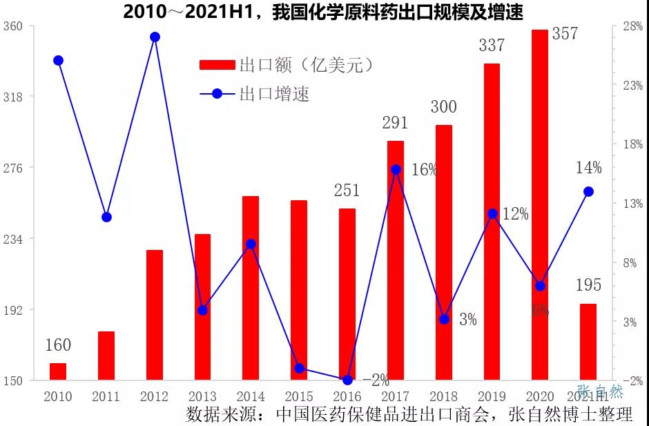 據中國醫保商會初步統計,2021年上半年,我國原料藥出口額達到195億美元,同比增長14%,但主要源自出口均價上漲18%驅動,就數量而言,出口同比反而減少了4%。主要是因為2020年下半年以來,全球大宗原材料價格和跨境物流費用的單邊上漲所致,屬于增收不增利,這也反映了全球原料藥需求有一定程度的下滑。