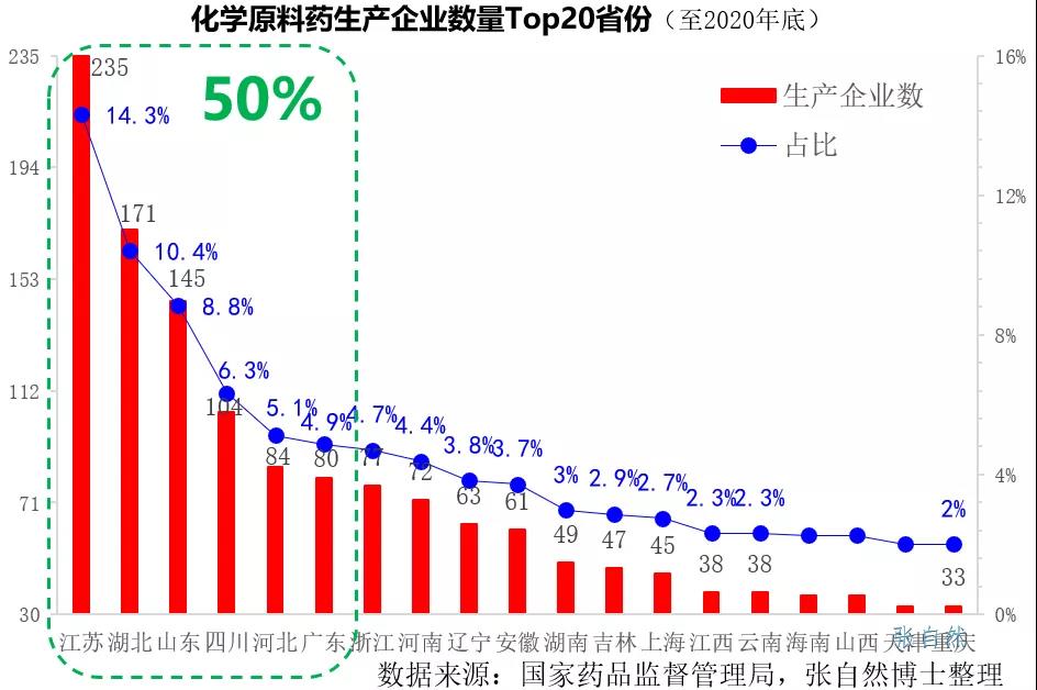 截至2020年底,我國共有化學原料藥生產企業1642家,其中原料藥生產企業最多的是江蘇省,共有235家,占全國的14.3%;其后是湖北、山東、四川、河北和廣東,分別有171家、145家、104家、84家和80家,上述6省共有819家原料藥生產企業,占到全國化學原料藥生產企業的半壁江山。