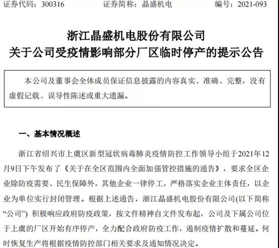 受浙江疫情防控影響,12月12日晚間,晶盛機(jī)電、鋒龍股份、中欣氟材、春暉智控、家聯(lián)科技、金盾股份、陽(yáng)光照明7家上市公司發(fā)布臨時(shí)停產(chǎn)公告,加上此前已發(fā)布臨時(shí)停產(chǎn)公告的貝斯美、浙江龍盛、皇馬科技、藥石科技、揚(yáng)帆新材、爭(zhēng)光股份6家上市公司,目前共有13家上市公司發(fā)布臨時(shí)停產(chǎn)公告。