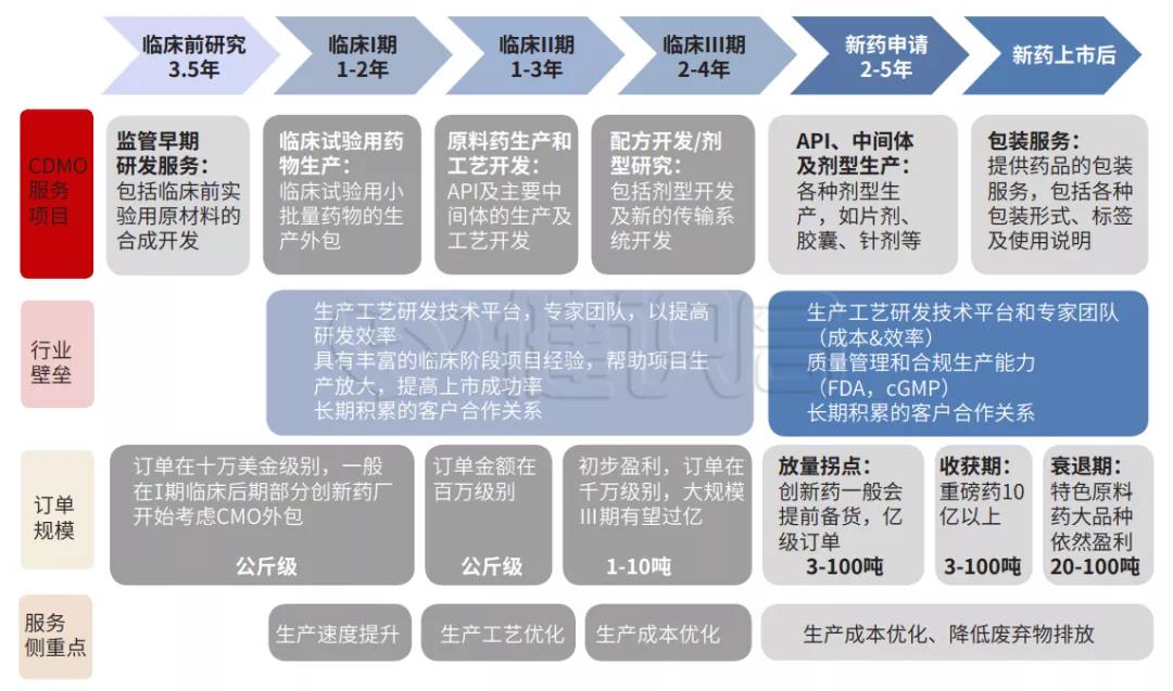 CDMO則最早由CMO而來,承接研發(fā)的后端,為藥企提供生產(chǎn)服務(wù)。更進(jìn)一步,為藥企提供工藝開發(fā)及制備、工藝優(yōu)化、商業(yè)化定制研發(fā)生產(chǎn)等服務(wù),成為更成熟的體系。