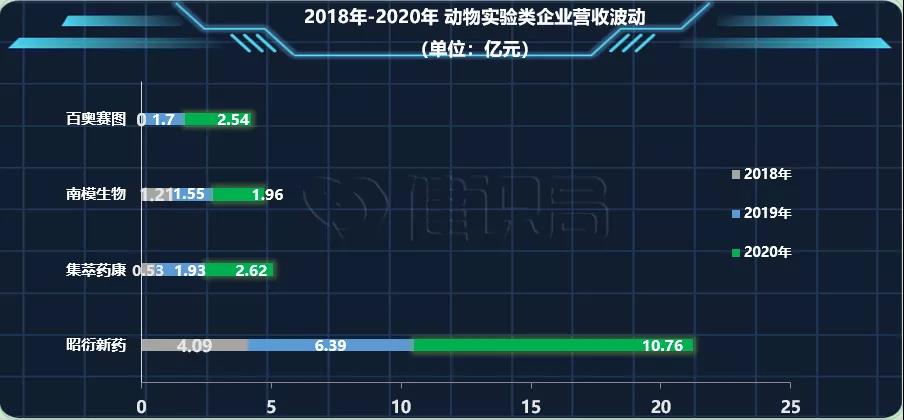 據(jù)公開披露數(shù)據(jù),動(dòng)物實(shí)驗(yàn)類企業(yè)在2019年、2020年實(shí)現(xiàn)了營收的快速發(fā)展。財(cái)務(wù)數(shù)據(jù)明明白白地告訴投資者:2018年醫(yī)藥投資高峰時(shí)期投下的錢、資助的研究,開始大批走入動(dòng)物實(shí)驗(yàn)階段。