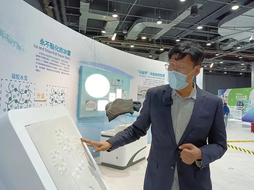 給水凝膠加上一層自制冷裝置,就能做出冰板、冰墻。升溫時水不滴落,可以用于制作精美浮雕——這是世界上現有的唯一可長期在冰上保存浮雕的技術方案。在科技館中展出的冰板上,就雕刻著“城樓”和“雪花”。雖然摸的人不少,但圖案的形狀一直保持清晰。