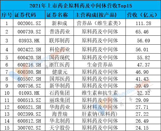 總的來說,前5名公司的原料藥及中間體業務營收都在50億元以上,top15的營收都在20億元以上。