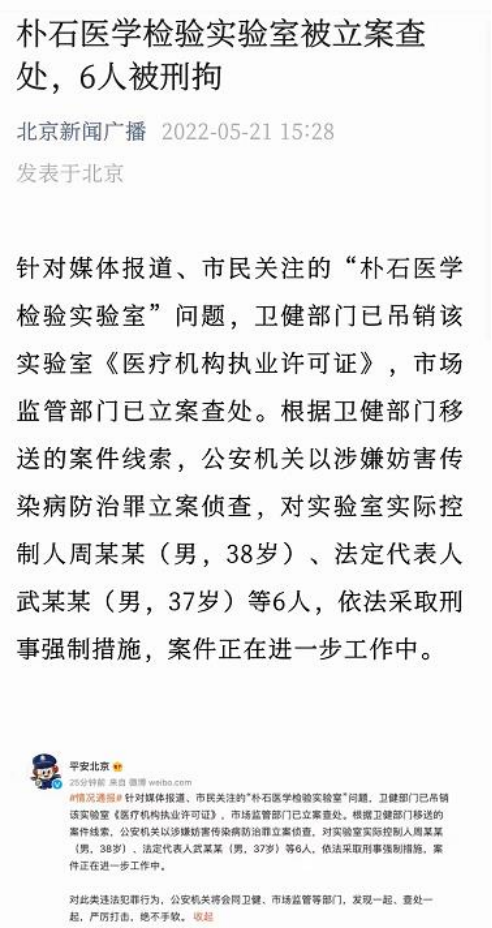 據(jù)平安北京微信公眾號消息,針對媒體報道、市民關注的“樸石醫(yī)學檢驗實驗室”問題,衛(wèi)健部門已吊銷該實驗室《醫(yī)療機構執(zhí)業(yè)許可證》,市場監(jiān)管部門已立案查處。