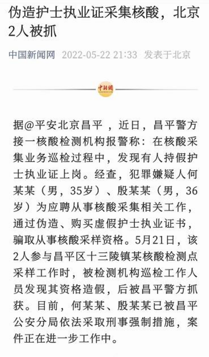 北京市公安局昌平分局官方微博發(fā)布消息,近日昌平警方接一核酸檢測機構報警稱:在核酸采集業(yè)務巡檢過程中,發(fā)現(xiàn)有人持假護士執(zhí)業(yè)證上崗。經查,犯罪嫌疑人何某某(男,35歲)、殷某某(男,36歲)為應聘從事核酸采集相關工作,通過偽造、購買虛假護士執(zhí)業(yè)證書,騙取從事核酸采樣資格。
