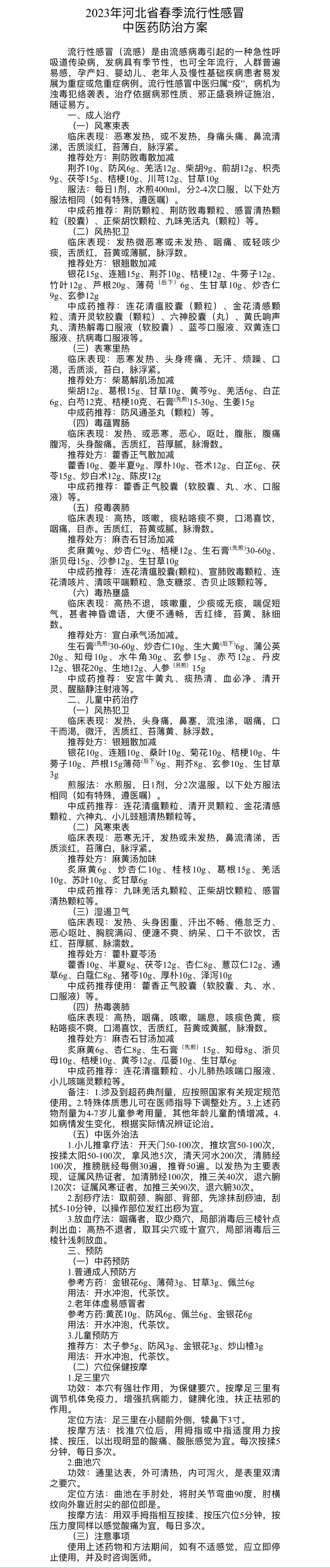 2023年河北省春季流行性感冒中醫(yī)藥防治方案