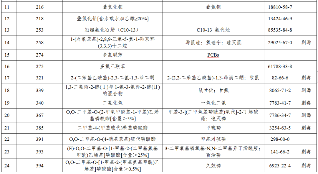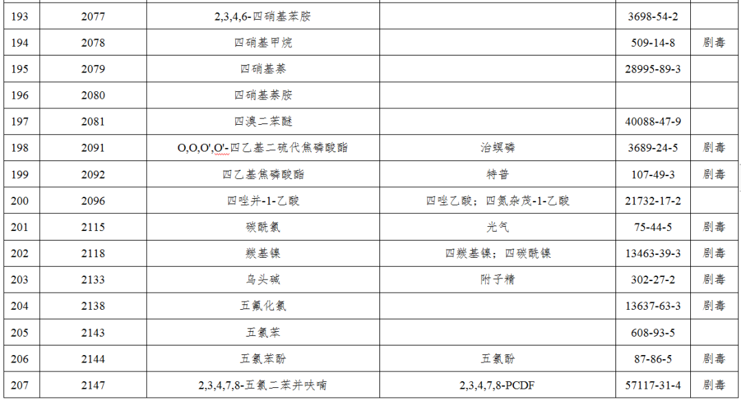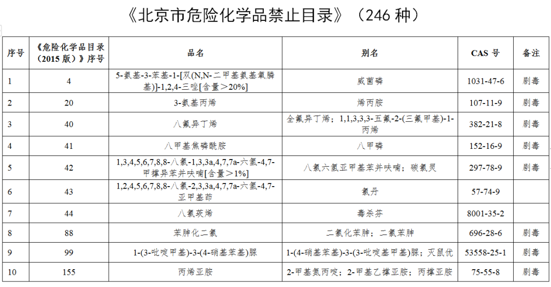 八甲磷、克百威、毒鼠強、水銀等246種?;窋M被列入禁止目錄,在北京行政區(qū)域內(nèi)禁止生產(chǎn)、儲存、使用、經(jīng)營和運輸(含過境運輸)。確需使用且符合首都功能定位和產(chǎn)業(yè)發(fā)展需求的,只能以符合要求的化學(xué)試劑包裝和氣瓶氣體形式使用和運輸。