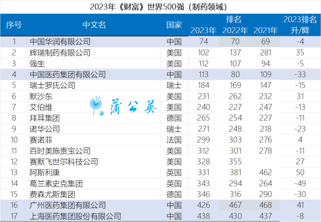 8月2日,2023年《財富》世界500強榜單發(fā)布,17家制藥公司上榜,其中,4家中國藥企榜上有名:中國華潤有限公司、中國醫(yī)藥集團有限公司、廣州醫(yī)藥集團有限公司、上海醫(yī)藥集團股份有限公司榜上有名。廣藥集團排名上升最快:廣藥集團連續(xù)第三年上榜,排名年年上升,今年位居第426位,比去年排名躍升41位,已經(jīng)連續(xù)兩年在榜且排名穩(wěn)步上升。 中國醫(yī)藥集團有限公司:113名,比去年下降33名; 上海醫(yī)藥集團股份有限公司:438名,比去年下降了8名。 上榜的跨國公司:第102位,輝瑞;第112位,強生;第184位,羅氏;第231位,默沙東;第240位,艾伯維;第265位,拜耳;第271位,諾華;第299位,賽諾菲;第312位,百時美施貴寶;第328位,賽默飛;第331位,阿斯利康;第343位,葛蘭素史克;第346位 費森尤斯。輝瑞,成為全球最大的制藥公司:輝瑞制藥有限公司排名上升35位至第102位,成為全球最大的制藥公司,利潤為31,372百萬美元。中美差距明顯:以輝瑞為代表的10家美國制藥企業(yè),平均銷售收入982億美元,平均利潤114億美元。上榜中國企業(yè)中被納入藥企行業(yè)只有中國醫(yī)藥和廣州醫(yī)藥兩家企業(yè)。這兩家企業(yè)平均銷售收入647億美元,平均利潤7.1億美元。兩項指標遠遠低于美國企業(yè)。利潤如此之低,企業(yè)難以投入足夠資金用于創(chuàng)新。生物醫(yī)藥行業(yè)是關(guān)系人類未來發(fā)展的行業(yè)。上榜中國企業(yè)與美國企業(yè)的差距表明,我們還有很長的路要走。