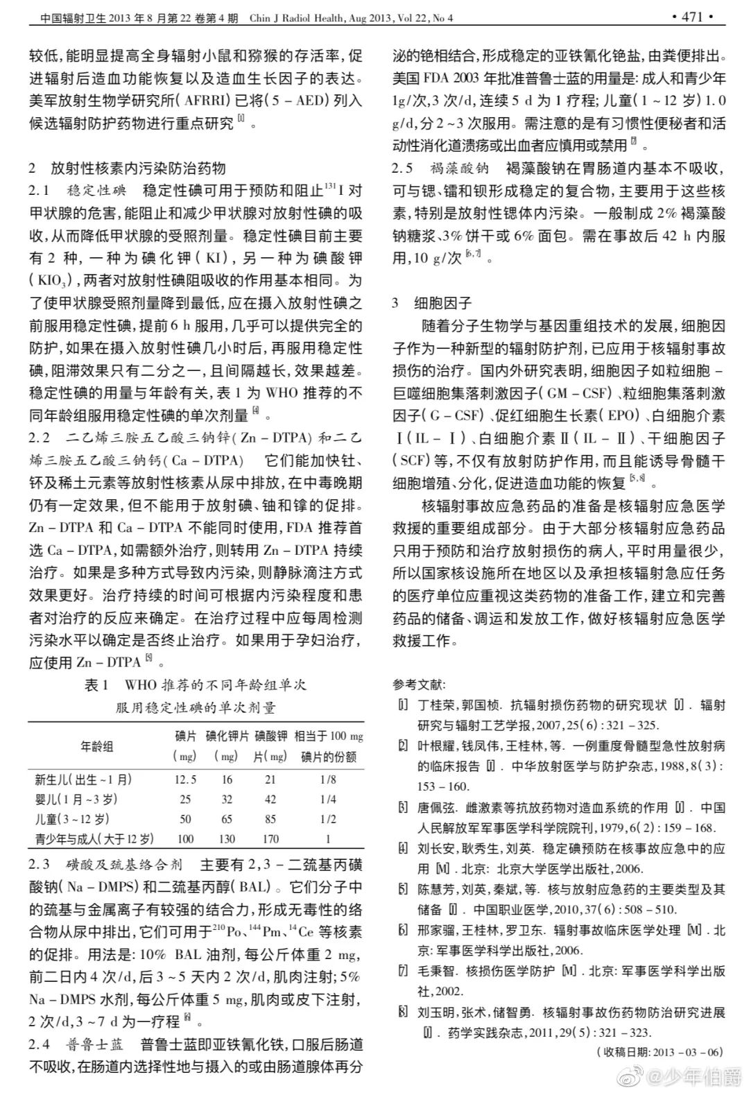 為了使甲狀腺受照劑量降到最低,應在攝入放射性碘之前服用穩定性碘,提前6小時服用,幾乎可以提供完全的防護,如果在攝入放射性碘幾小時后,再服用穩定性碘,阻滯效果只有二分之一,且間隔越長,效果越差。穩定性碘的用量與年齡有關,表1(見后文圖片)為WHO推薦的不同年齡組服用穩定性碘的單次劑量。