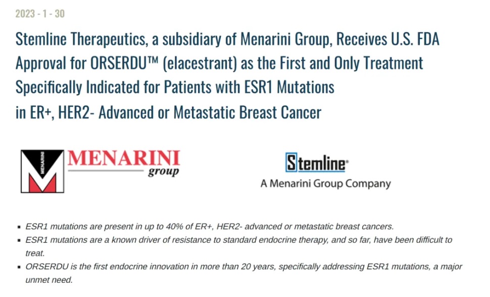 2、2023年1月,FDA批準Elacestrant(Orserdu)用于既往接受過至少一線內分泌治療后疾病進展的ER+、HER2-、ESR1突變的絕經后女性或成年男性晚期或轉移性乳腺癌患者。在美國和歐洲由Menarini的全資子公司Stemline Therapeutics將Orserdu商業化,這也是FDA批準的首個口服SERD(選擇性雌激素受體降解劑),在此之前,阿斯利康的氟維司群(fulvestrant)是唯一獲批上市的SERD靶向藥,但是只能肌肉注射。