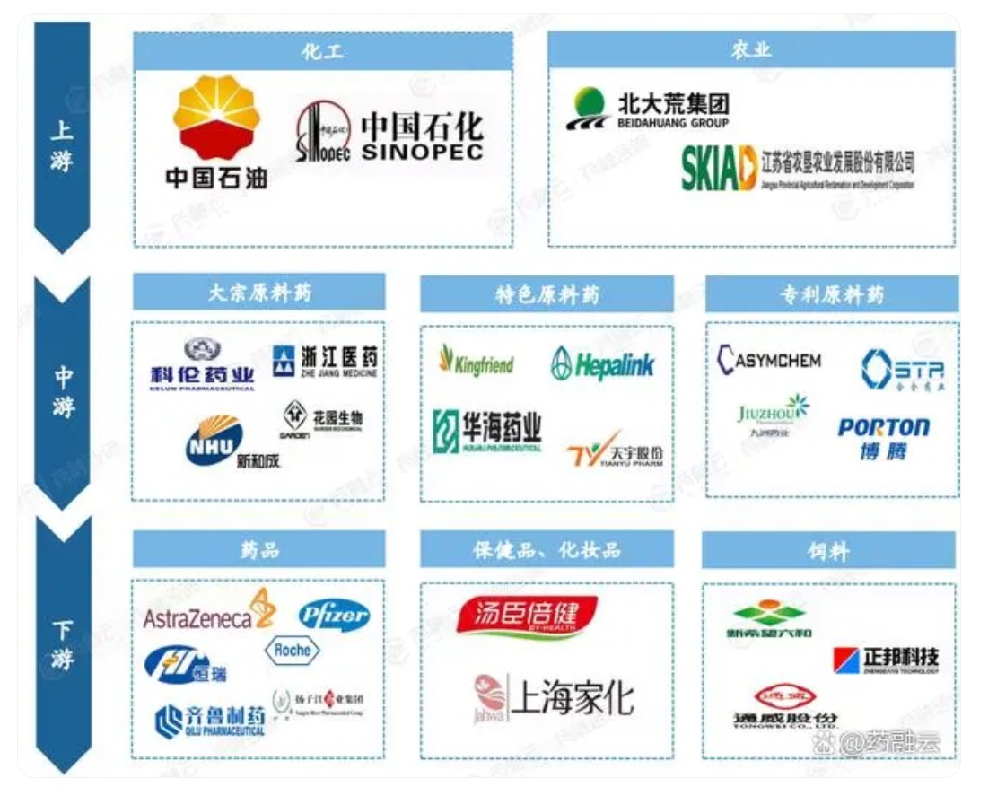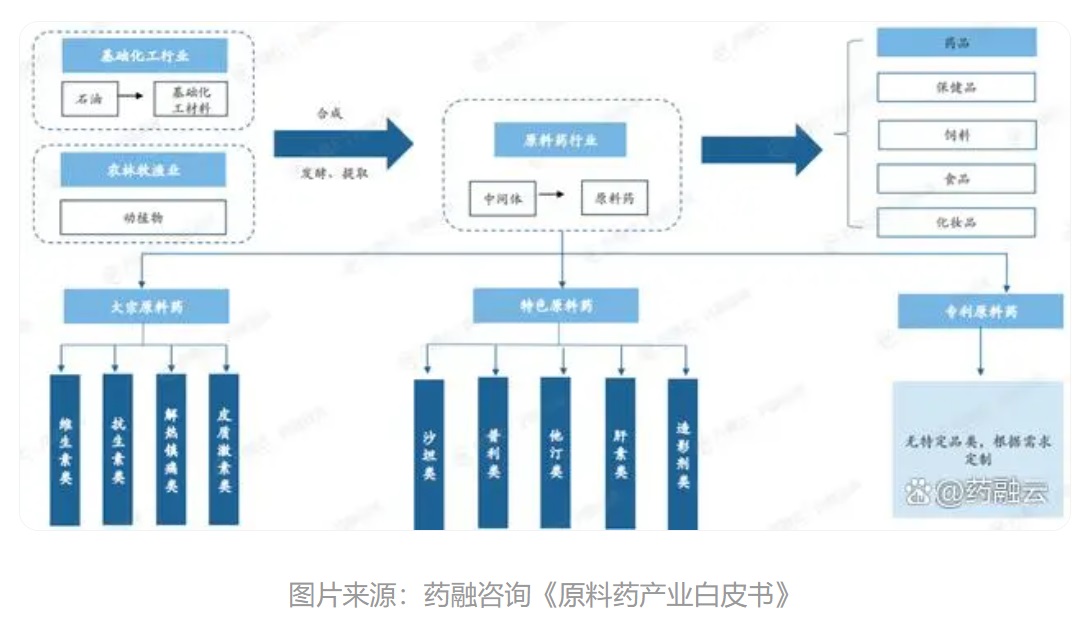 原料藥產業鏈涵蓋了上游的基礎化工和農林牧漁業,主要包括基礎化工、植物種植、動物養殖和部分醫藥中間體制備等;中游的原料藥生產,即通過化學合成、動植物提取、微生物發酵或其他現代生物技術等制備得到原料藥;以及下游的化學制劑生產等多個環節。